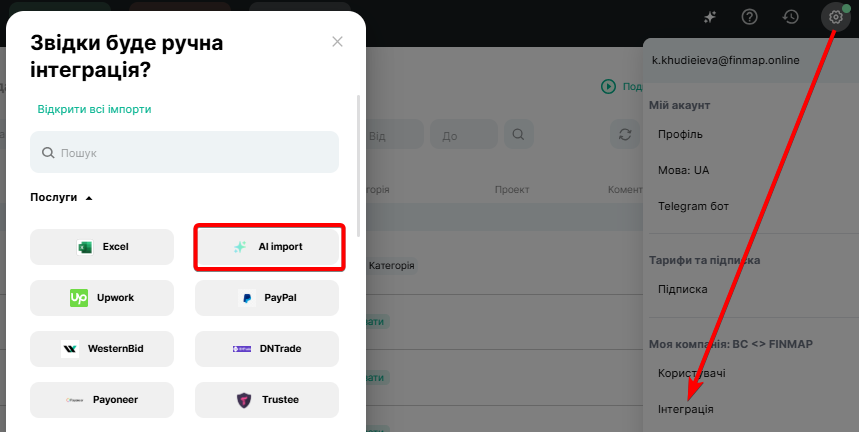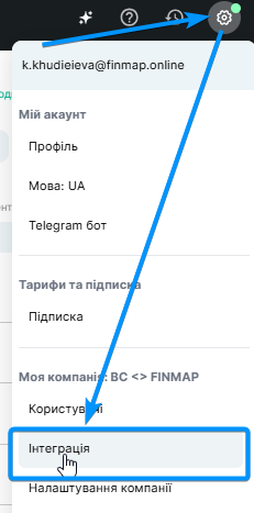 У головному меню Finmap відкрийте «Налаштування» → «Інтеграція».