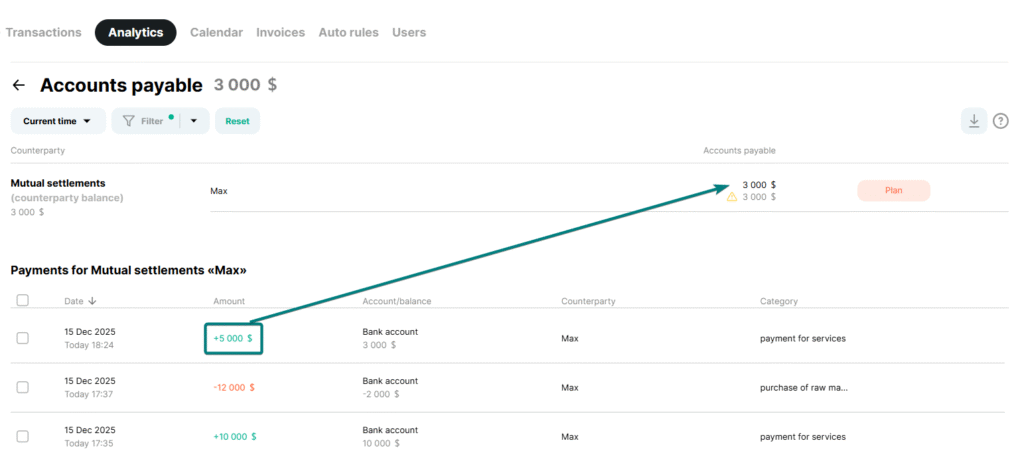 With a partial repayment of, for example, $3,000, the amount of accounts payable under mutual settlements will decrease to $2,000.