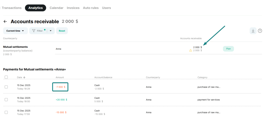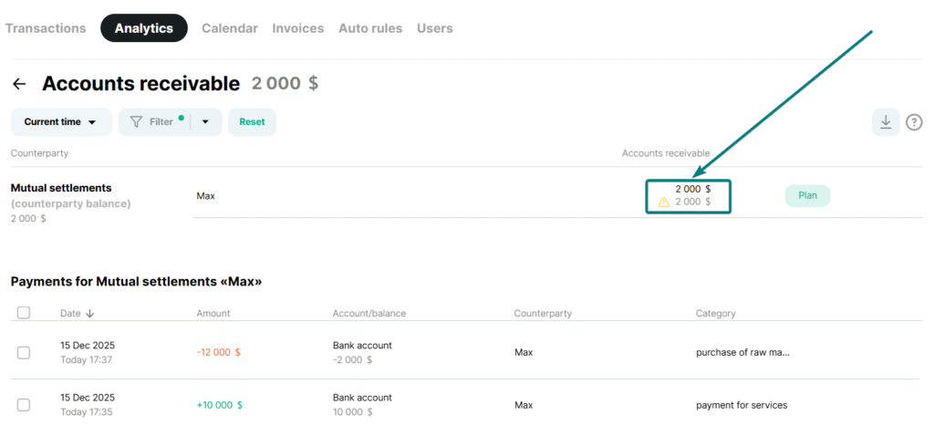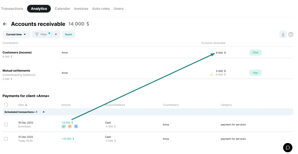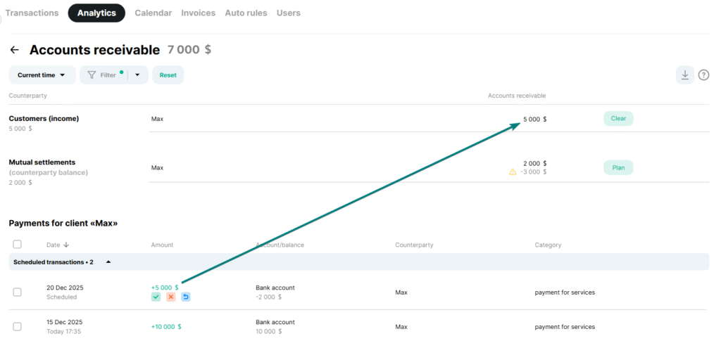 When you create a future revenue payment, you will see a record of it in the Accounts Receivable report. Opposite the counterparty in the Settlements section, you will see the difference between the planned revenue and what the counterparty already owes you.