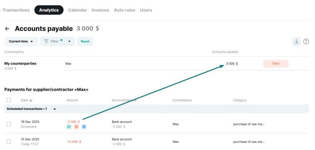 When you create a future expense payment, you will see a record of it in the Creditor report. Opposite the counterparty in the Settlements section, you will see the difference between the planned expense and what you already owe the counterparty.