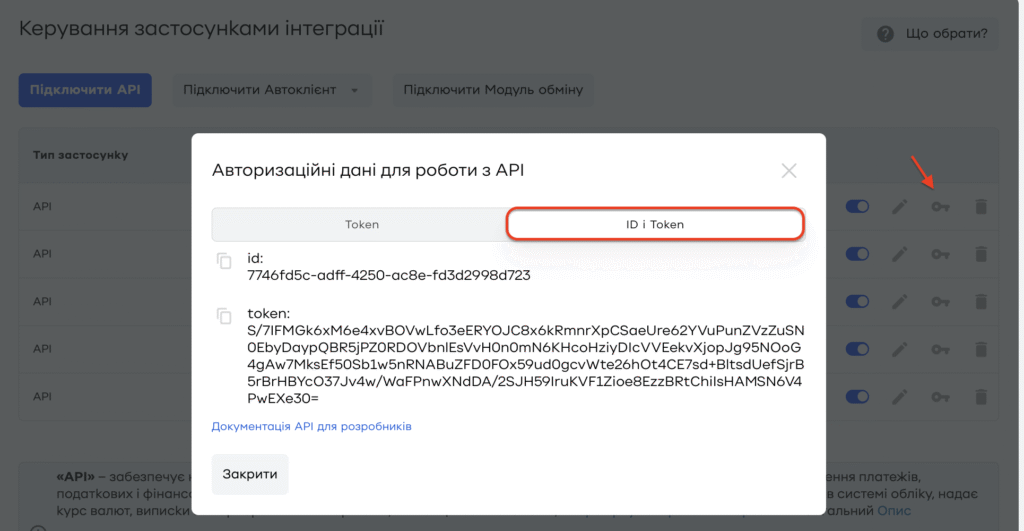 ㅤ5.ㅤДалі натискаємо “іконку ключика” та копіюємо параметри id і token.