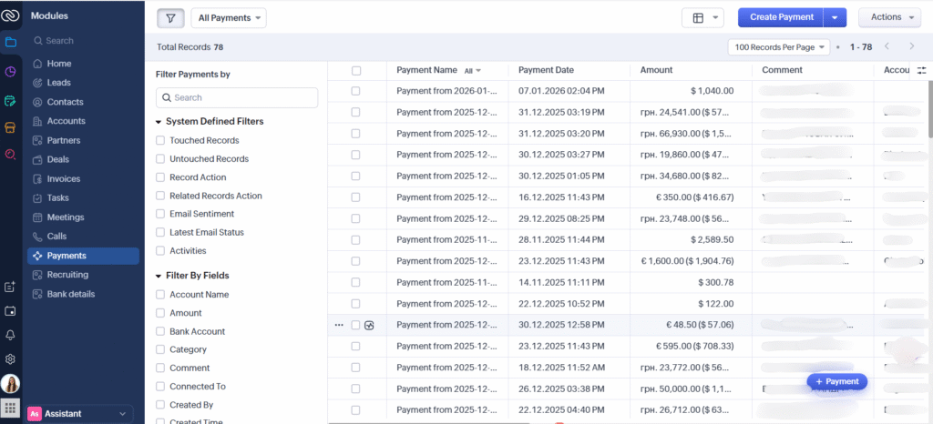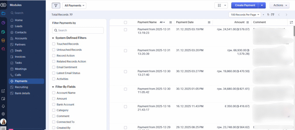 Інтеграція потрібна, щоб менеджери з продажу бачили оплати майже миттєво прямо в Zoho CRM — без очікування бухгалтера і без доступу до фінансової системи.