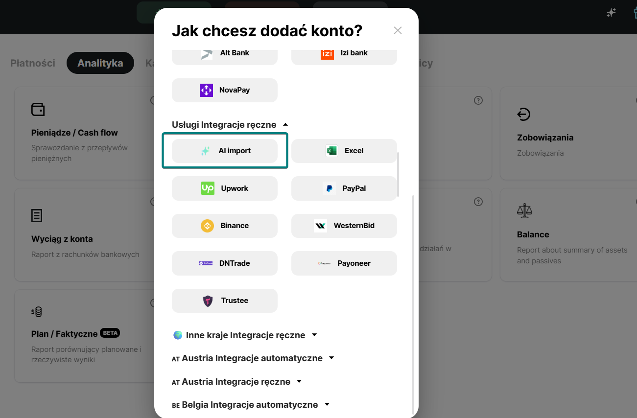 Nie widzisz swojego banku na liście integracji Finmap? Nie ma problemu — spróbuj importu AI.