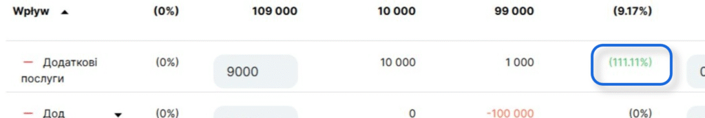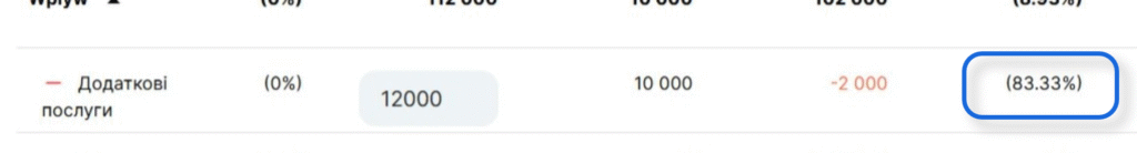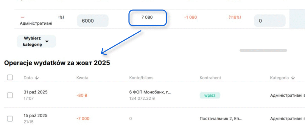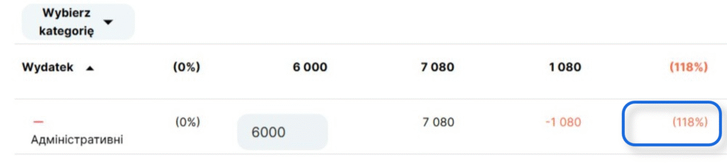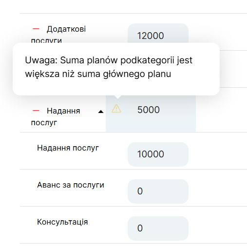 - Jeśli kwota w kategorii głównej wynosi 5000, a łączna kwota w jej podkategoriach — 7000, system będzie wyświetlać ikonę z wykrzyknikiem informującą o błędzie.