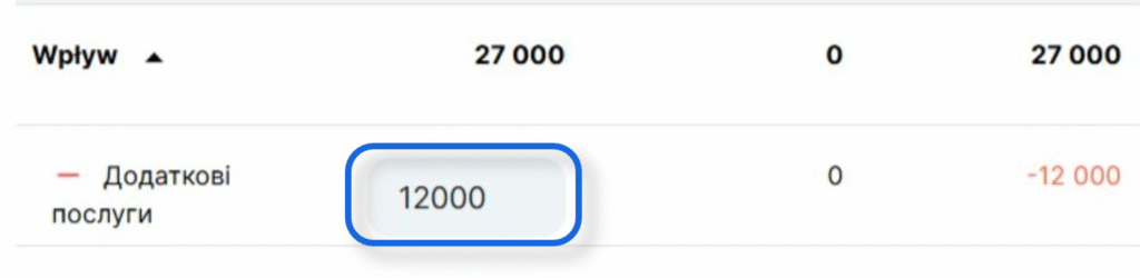 - Należy wybrać kategorię i wprowadzić zaplanowaną kwotę przychodów/kosztów w odpowiednim polu, które automatycznie zapisuje wprowadzoną wartość.
