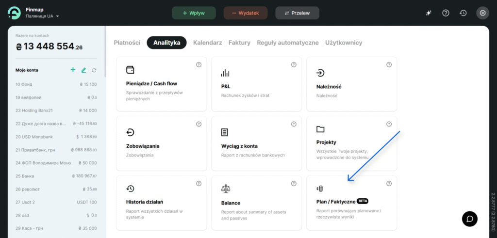 Raport „Plan/Wykonanie” znajduje się w sekcji „Analityka”.