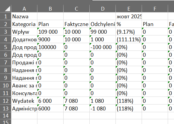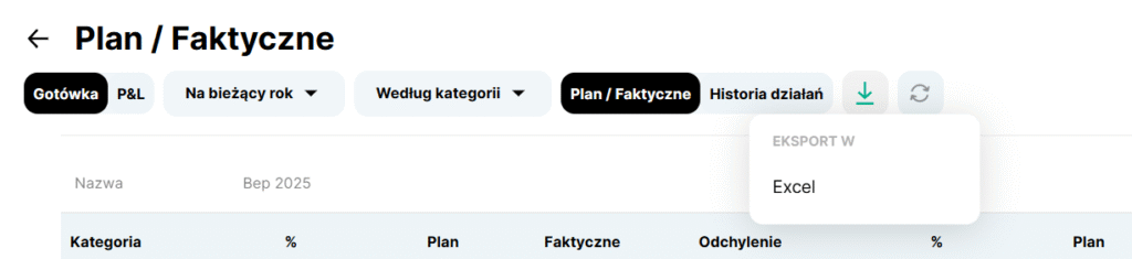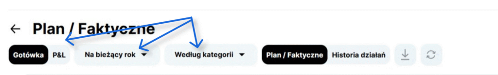 - Dane rzeczywiste są automatycznie podstawiane z raportów Cash Flow lub P&L, w zależności od wybranego filtra.