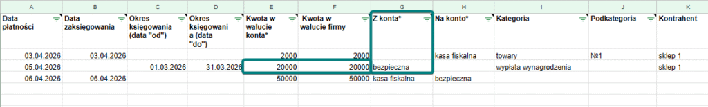 W kolumnie „Z konta” należy podać nazwę konta, z którego nastąpił wydatek. W tym przypadku wpisujemy kwotę bez znaku „-„