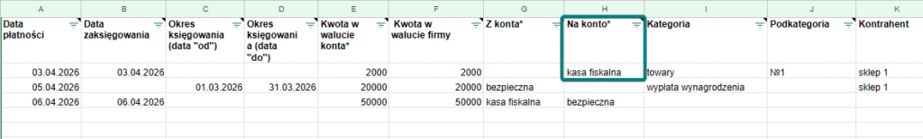 Aby pokazać, że są to transakcje przychodowe (+), użyj kolumny „Na konto”.