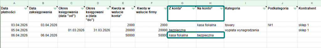 Podczas tworzenia przelewu między kontami wprowadź nazwy kont w obu kolumnach, zgodnie z tym, z którego konta i na które konto zostały przelane pieniądze: