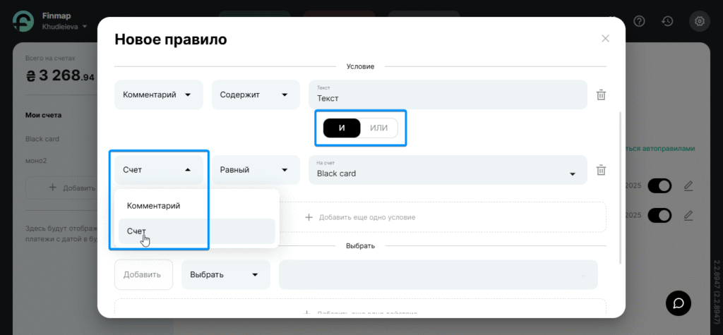 Кроме условий по комментариям, можно выбрать условие отработки правила по определенному счету. Это позволяет сервису ориентироваться не только на текст комментария в операции, но и на то, через какой счет проходит платеж.