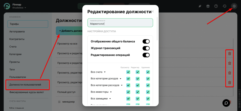 Чтобы изменить настройки доступа должности, перейдите в раздел «Пользователи», нажмите на должности сотрудника и в открывшемся окне измените разрешения на доступ к нужным вам разделам, отчетам, данным