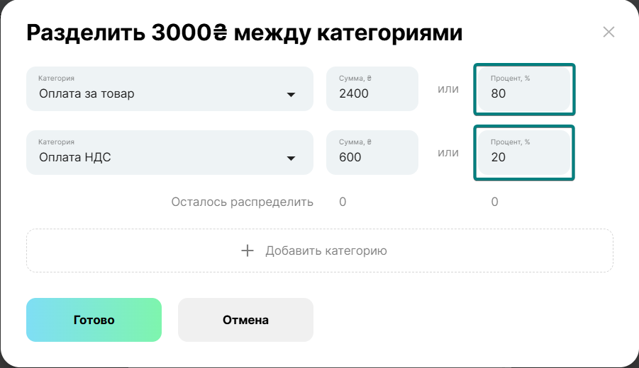 ㅤ - Нажав на операцию, в открывшемся окне редактирования платежа можно разделить ее на эти категории (суммы можно внести сразу в процентах, например 80% и 20% соответственно).