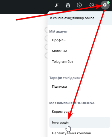 ㅤ2.ㅤДалі знову відкрийте Налаштування у Finmap (верхній правий кут), виберіть Інтеграція Excel