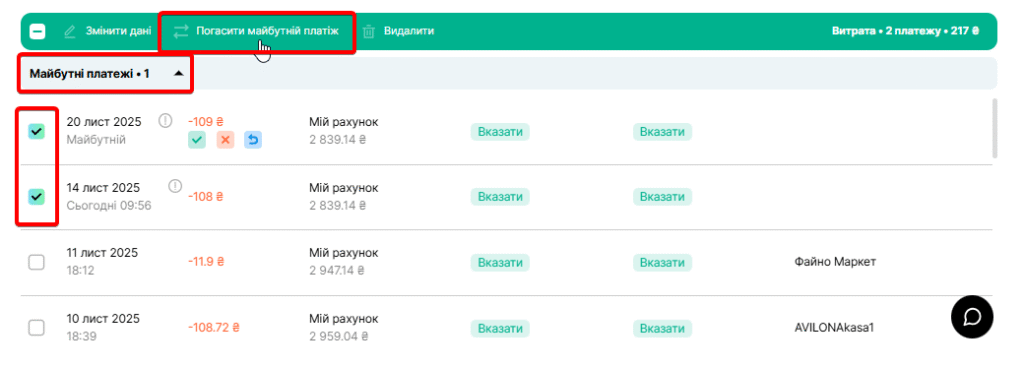 ㅤБіля фактичної та майбутньої операції, сервіс показуватиме підказку “і” для об’єднання цих двох платежів: